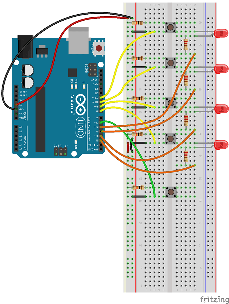 - LED 1, 2, 3, 4 is connected to digital pin 2, 3, 4 and 5 respectively.