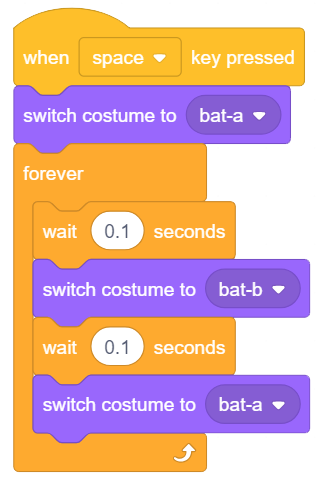 - Copy the two blocks added in step 4, and drop them below the switch costume to () block inside the forever block; change the costume to bat-a.