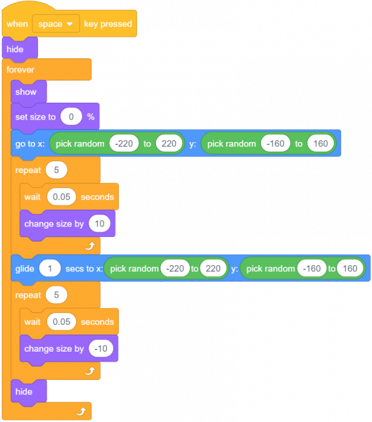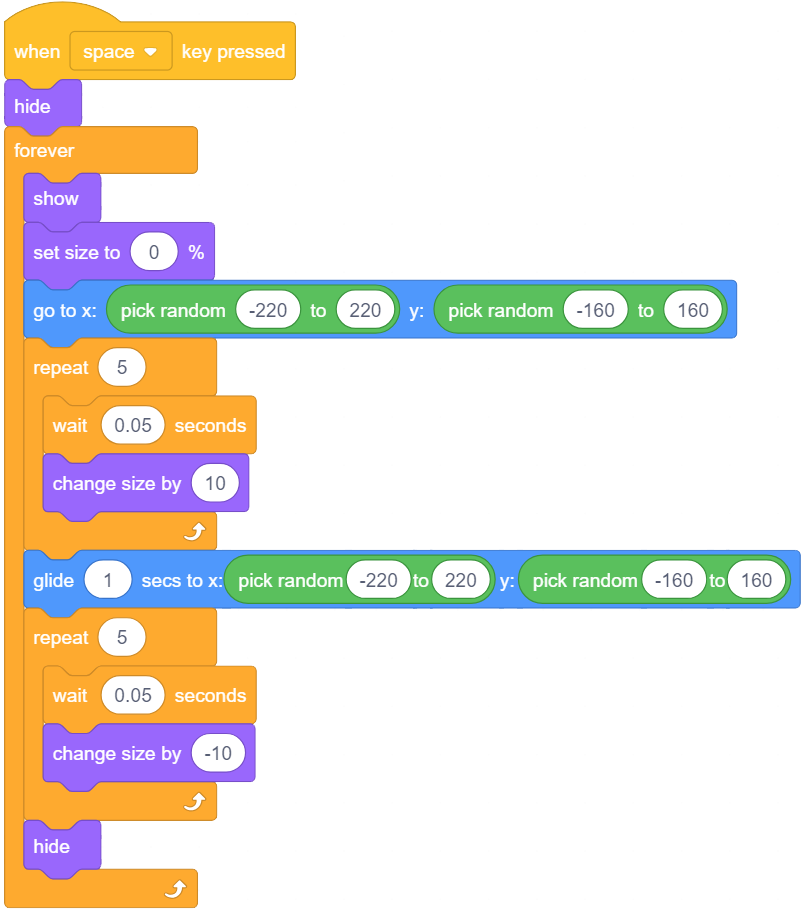 Below this repeat block, drag and drop the hide block to finally make the bat disappear. With this, our script is complete!