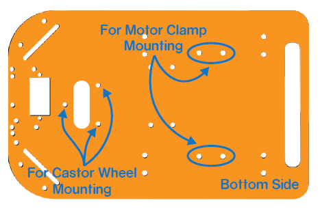 The robot chassis (also called the base plate) with the required markings are shown in the figure below. When you start, keep in mind that the side shown is the bottom side; the top side has the evive logo printed on it.