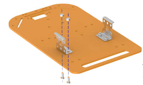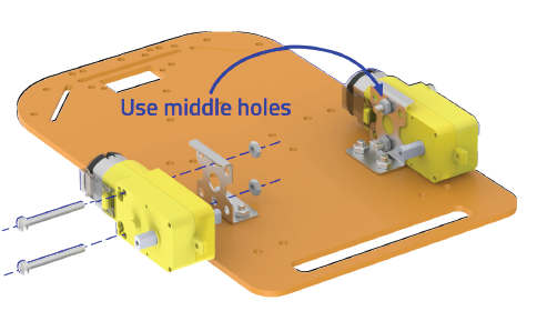 - Fasten the motor mounting brackets onto the chassis using 8mm M3 bolts and M3 nuts. Be cautious about the holes you’re using; refer to the figure to avoid confusion.