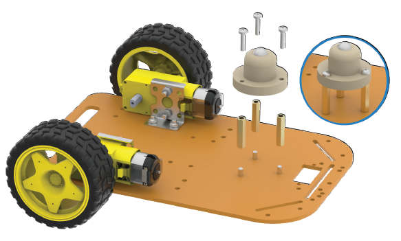 Till now, our robot has two feet – sorry wheels. But it ain’t no human! So it needs at least one more to be stable and be able to walk around on its own. Come in, the castor wheel! - Fasten three 20mm M3 standoffs onto the chassis using 8mm M3 bolts, as shown in the figure. Now fasten the castor wheel to the standoffs using 12mm length M3 bolts. Now the robot is ‘standing on its own feet’. (Its parents will be so proud!)