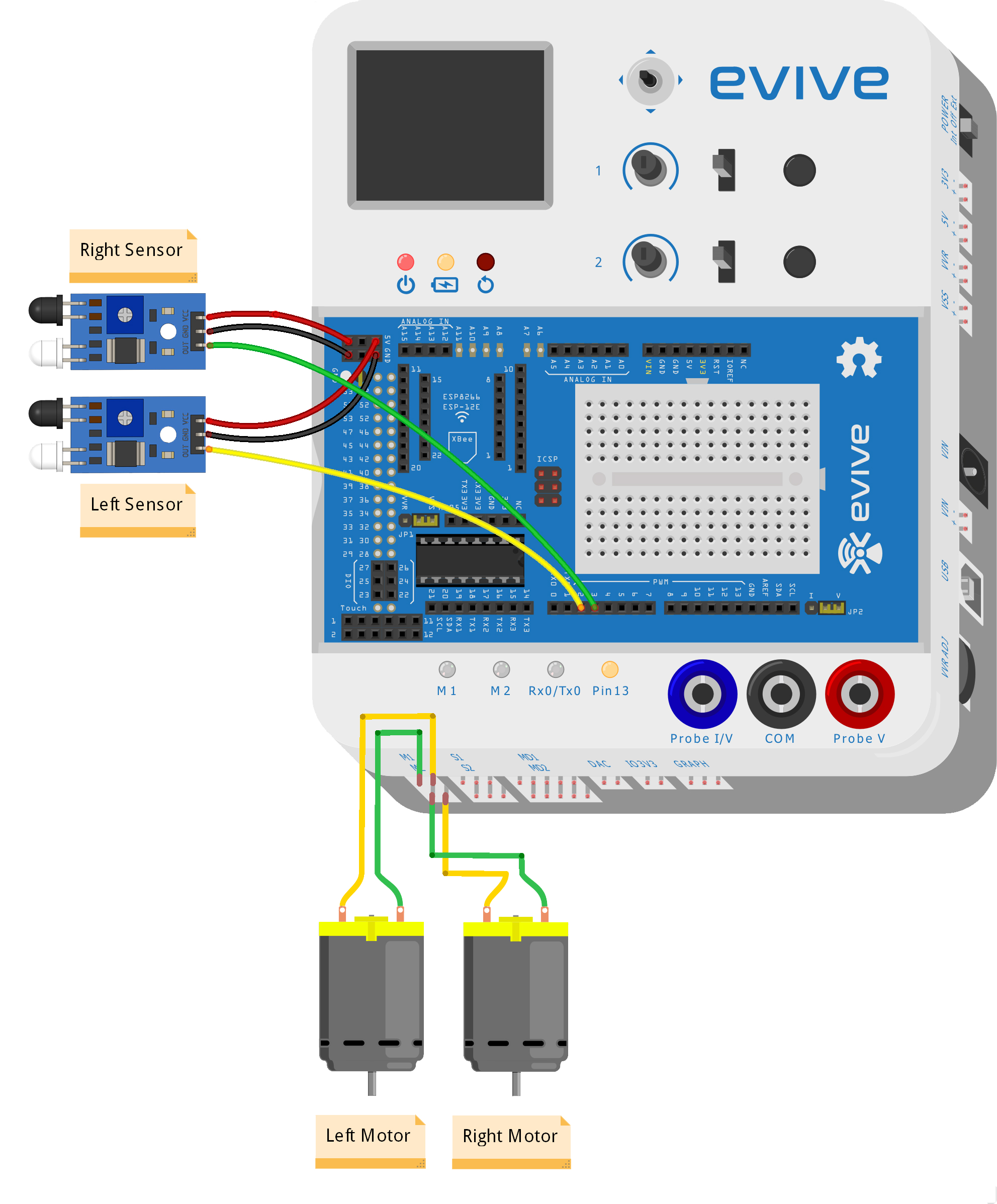 The connections you need to make are also piece of cake. You just need to connect to sensors as shown in the circuit diagram below. The motors remain connected as they were when you made you made your first ever Smartphone controlled robot. No extra work!